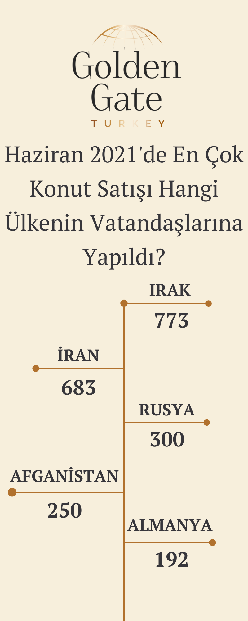 Haziran ayında Irak vatandaşları Türkiye’den 773 konut satın aldı. Irak vatandaşlarını sırasıyla, 683 konut ile İran, 300 konut ile Rusya Federasyonu, 250 konut ile Afganistan ve 192 konut ile Almanya vatandaşları izledi.