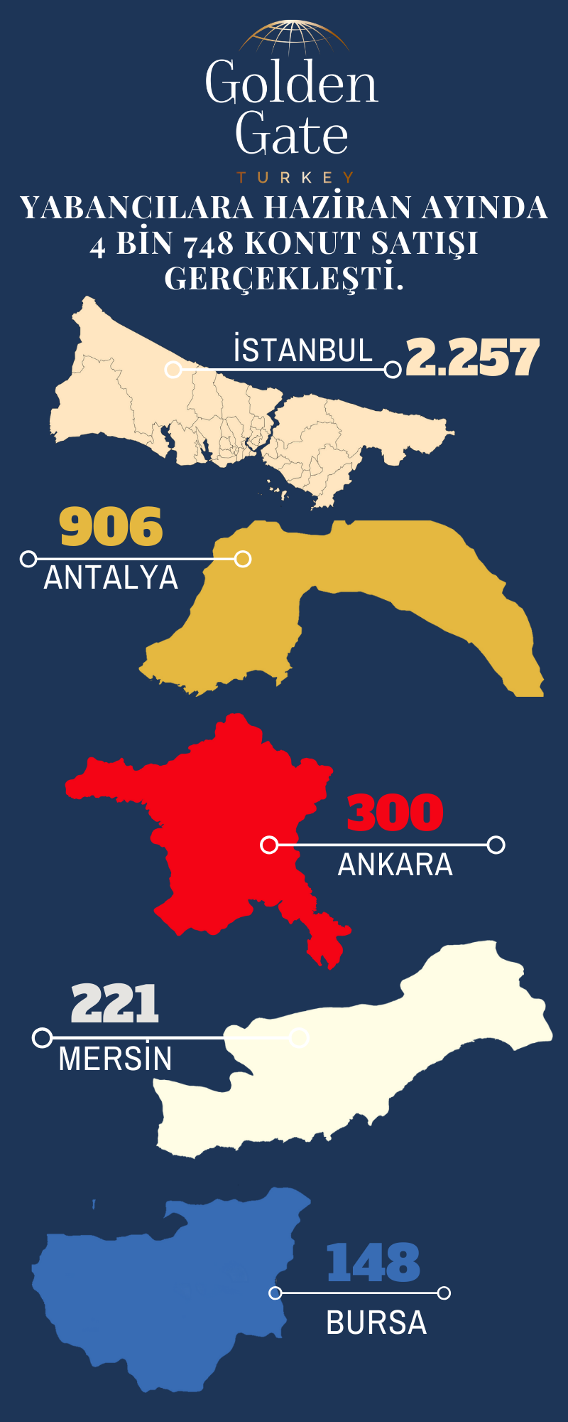 İstanbul’u sırasıyla 906 konut satışı ile Antalya, 300 konut satışı ile Ankara, 221 konut satışı ile Mersin ve 148 konut satışı ile Bursa izledi.