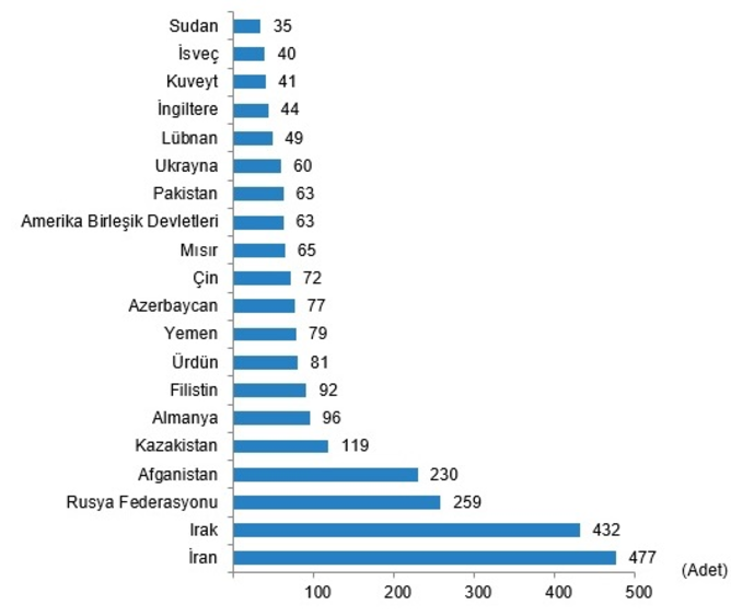 İran vatandaşlarını sırasıyla, 432 konut ile Irak, 259 konut ile Rusya Federasyonu, 230 konut ile Afganistan ve 119 konut ile Kazakistan vatandaşları izledi.